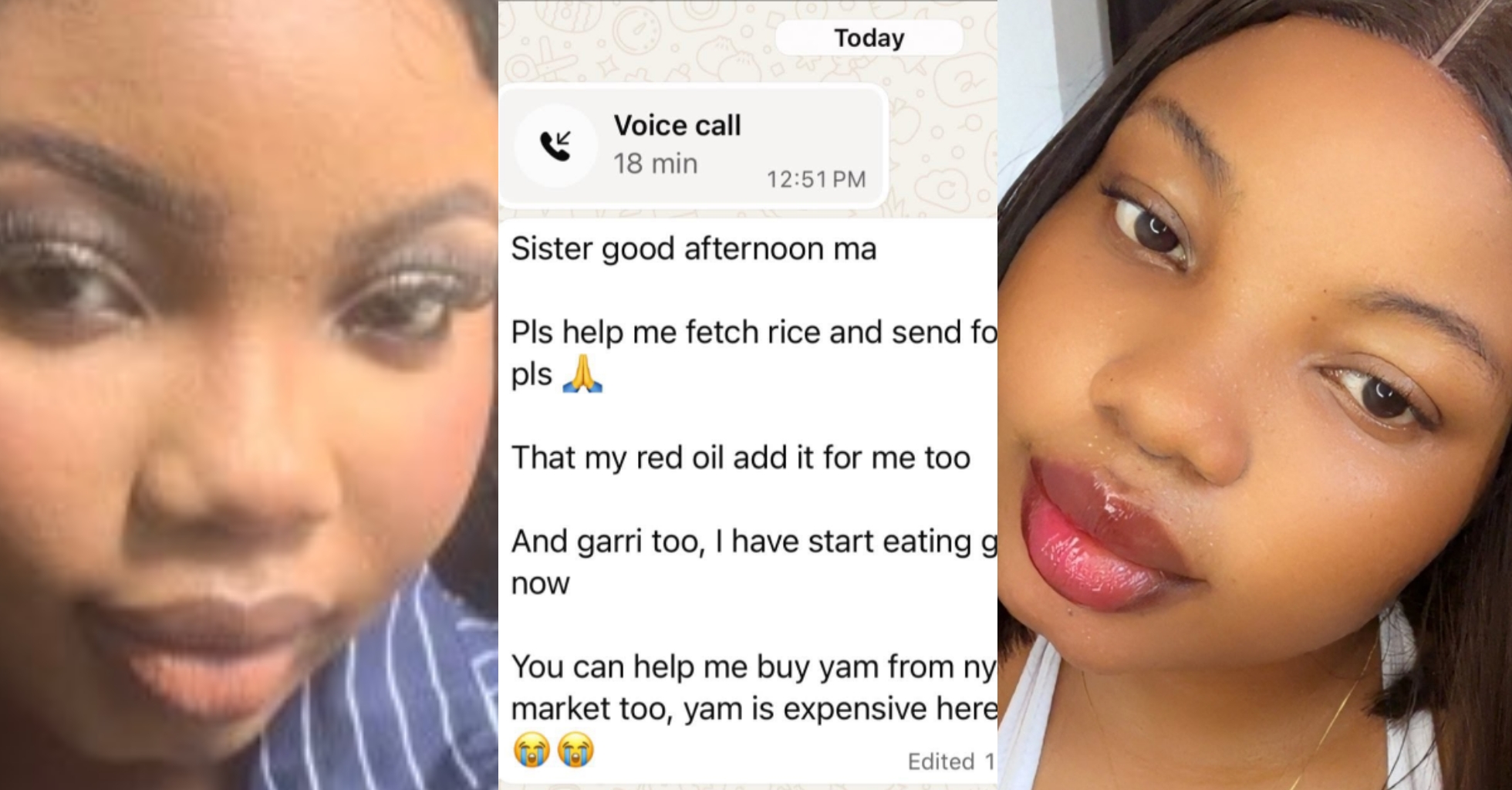 News update “I begged her”- Lady shares message from lastborn who refused to carry Garri to school A Nigerian lady has gone viral online after sharing a WhatsApp message received from her younger sister, studying at university. Ariyo Orukotan February 17, 2026 1 minute read A Nigerian lady has gone viral online after sharing a WhatsApp message received from her younger sister, studying at university. Please like and share : Post navigation Previous: “I’m allergic to poor men” — Lady says poor men shouldn’t spoil her anointingNext: Davido reacts to Tonto Dikeh’s family photos with ex-husband amid custody battle with Sophia Momodu Related Stories News update Supacell actor, Ghetts sentenced to 12 years in prison over fatal hit-and-run crash Newsflez March 3, 2026 News update Super Falcons beat Cameroon 3-1 in 2026 WAFCON warm-up Newsflez March 3, 2026 News update “What audacity is this?’ – Lady cries out over man’s request after sending her ₦1.5M Newsflez March 3, 2026