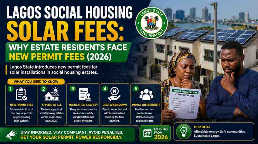 News update Lagos Social Housing Solar Fees: Why Estate Residents Face New Permit Fees (2026) The Solar Tax is simply an administrative cost for structural changes on government-owned properties and does not apply to some areas. Newsflez April 24, 2026 1 minute read The Solar Tax is simply an administrative cost for structural changes on government-owned properties and does not apply to some areas. Please like and share : Post navigation Previous: India denounces ‘hellhole’ remark shared by TrumpNext: “Pls, am I wicked?” – Married lady cries out as husband accuses her of being wicked to nephew Related Stories News update US considers suspending Spain from NATO, reported internal email suggests Newsflez April 24, 2026 News update Number of amputees set to rise in Gaza as Israel blocks aid, NGO warns Newsflez April 24, 2026 News update Sanusi Lamido Sanusi praises Alex Otti, says public office is not for wealth Newsflez April 24, 2026