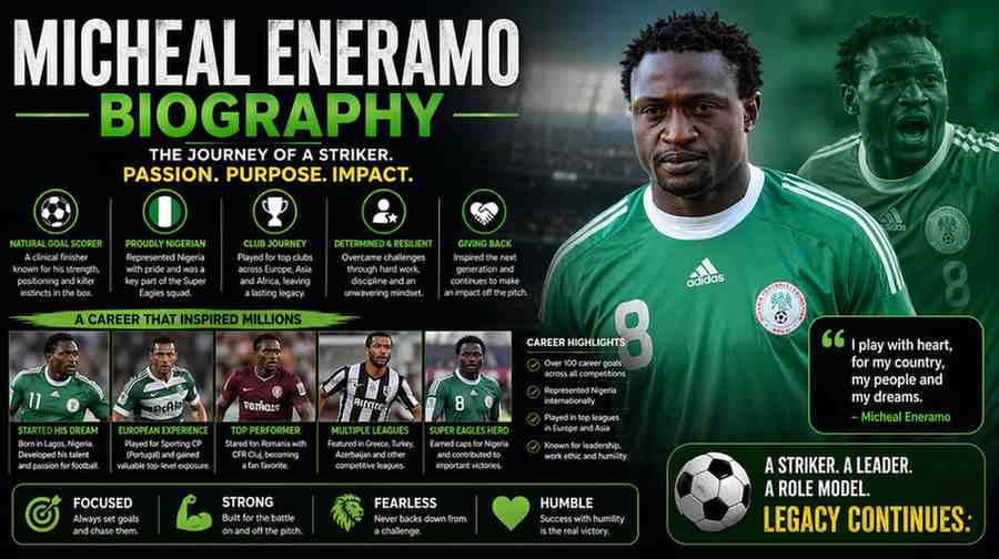 News update Michael Eneramo Biography: Early Life, Career, Legacy, Death, Family & Net Worth Michael Eneramo (26 November 1985 - 24 April 2026) was a Nigerian professional football striker who had 295 games and 126 goal tournaments. Newsflez April 24, 2026 1 minute read Michael Eneramo (26 November 1985 – 24 April 2026) was a Nigerian professional football striker who had 295 games and 126 goal tournaments. Please like and share : Post navigation Previous: Trump to again end legal status of people who entered US with CBP One appNext: “I walked out “- Lady attends husband’s sidechick’s naming ceremony, shares what she did Related Stories News update Israel kills at least 12 Palestinians in Gaza amid ‘ceasefire’ Newsflez April 24, 2026 News update “She always travels to Abuja…” – Matchmaker exposes shocking fiancée and father-in-law affair Newsflez April 24, 2026 News update FG approves increase in allowances, boosts welfare for civil servants Newsflez April 24, 2026